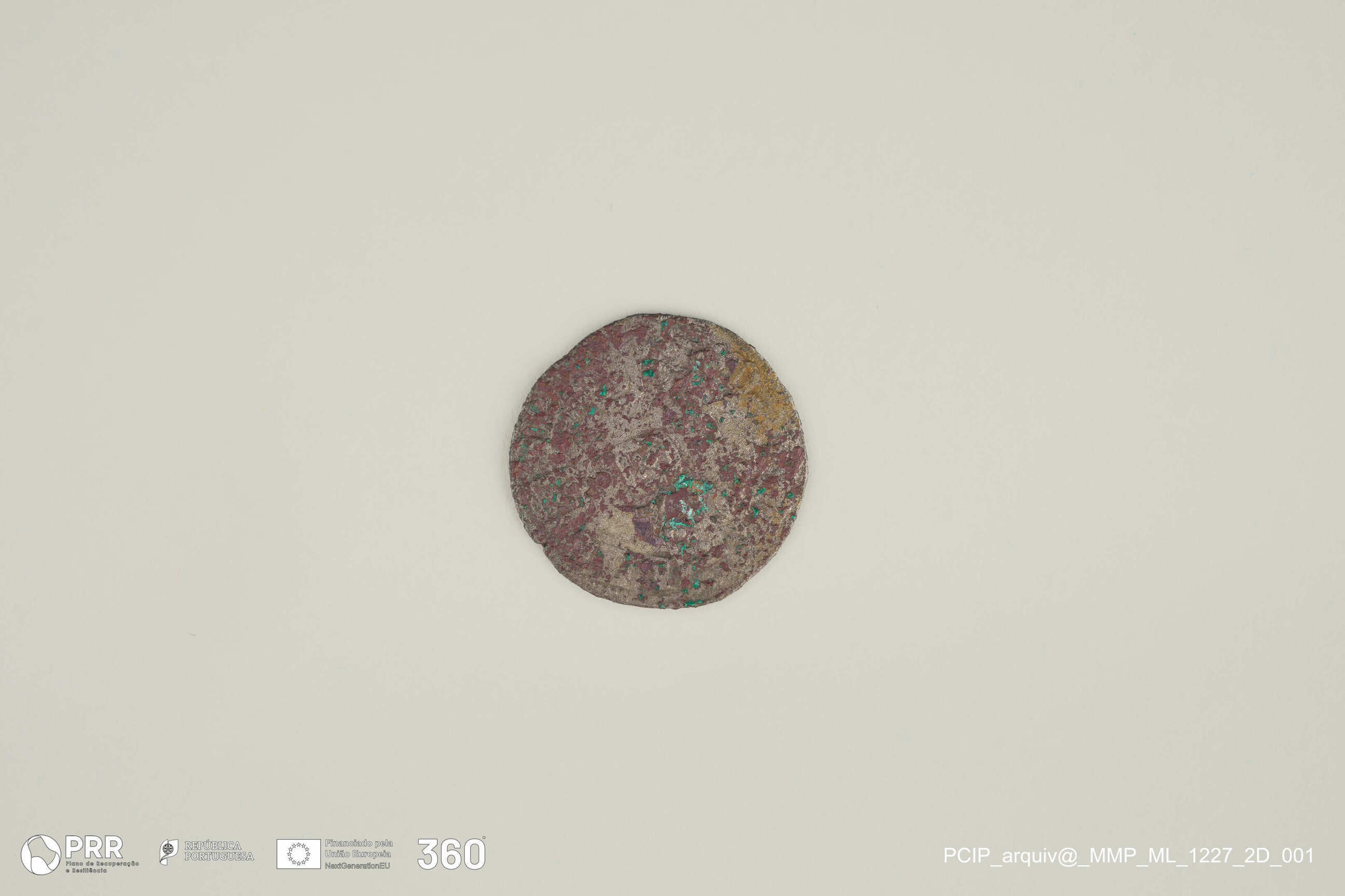 Matéria/Técnica: Batida a martelo; Cronologia: 1367-1383; Autoria: Desconhecida; Dimensões (cm): Diâmetro: 1,9.