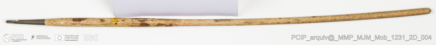 Matéria/Técnica: Madeira, metal e rama; Cronologia: Desconhecida; Autoria: Desconhecida; Dimensões: Comprimento: 31,5 cm.