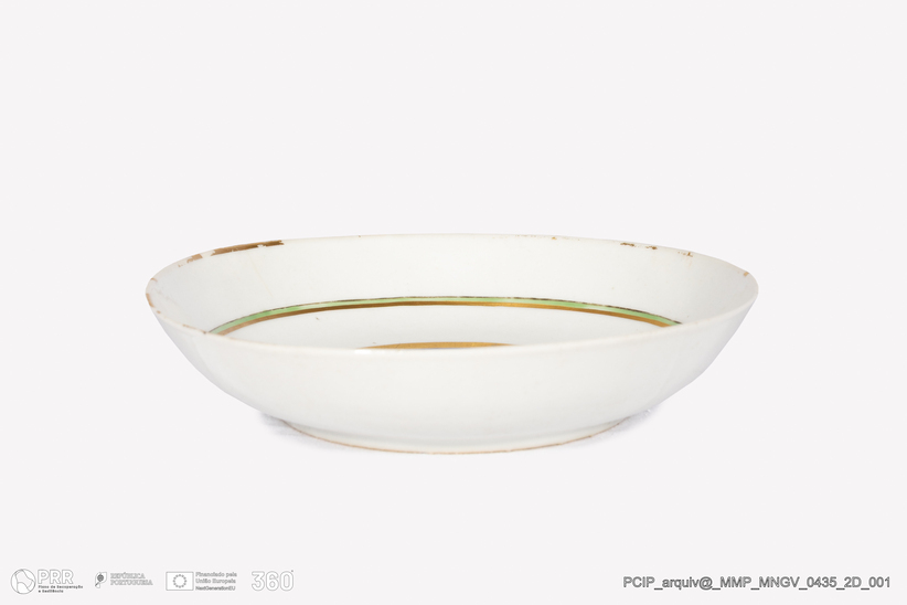 Matéria/Técnica: Peça de forma circular em porcelana branca decorada a ouro, verde, azul e manganês sobre um vidrado transparente; Cronologia: Desconhecida; Autoria: Desconhecida; Dimensões: Desconhecidas.