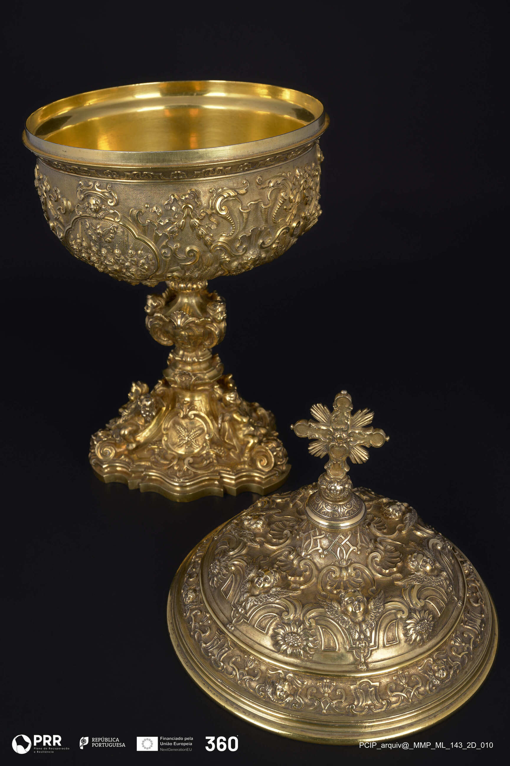 Matéria/Técnica: Prata dourada, relevada e incisa; Cronologia: 1751-1800; Autoria: Desconhecida; Dimensões (cm): Altura: 38 x Largura: Base: 13,8 x Diâmetro: copa: 18.