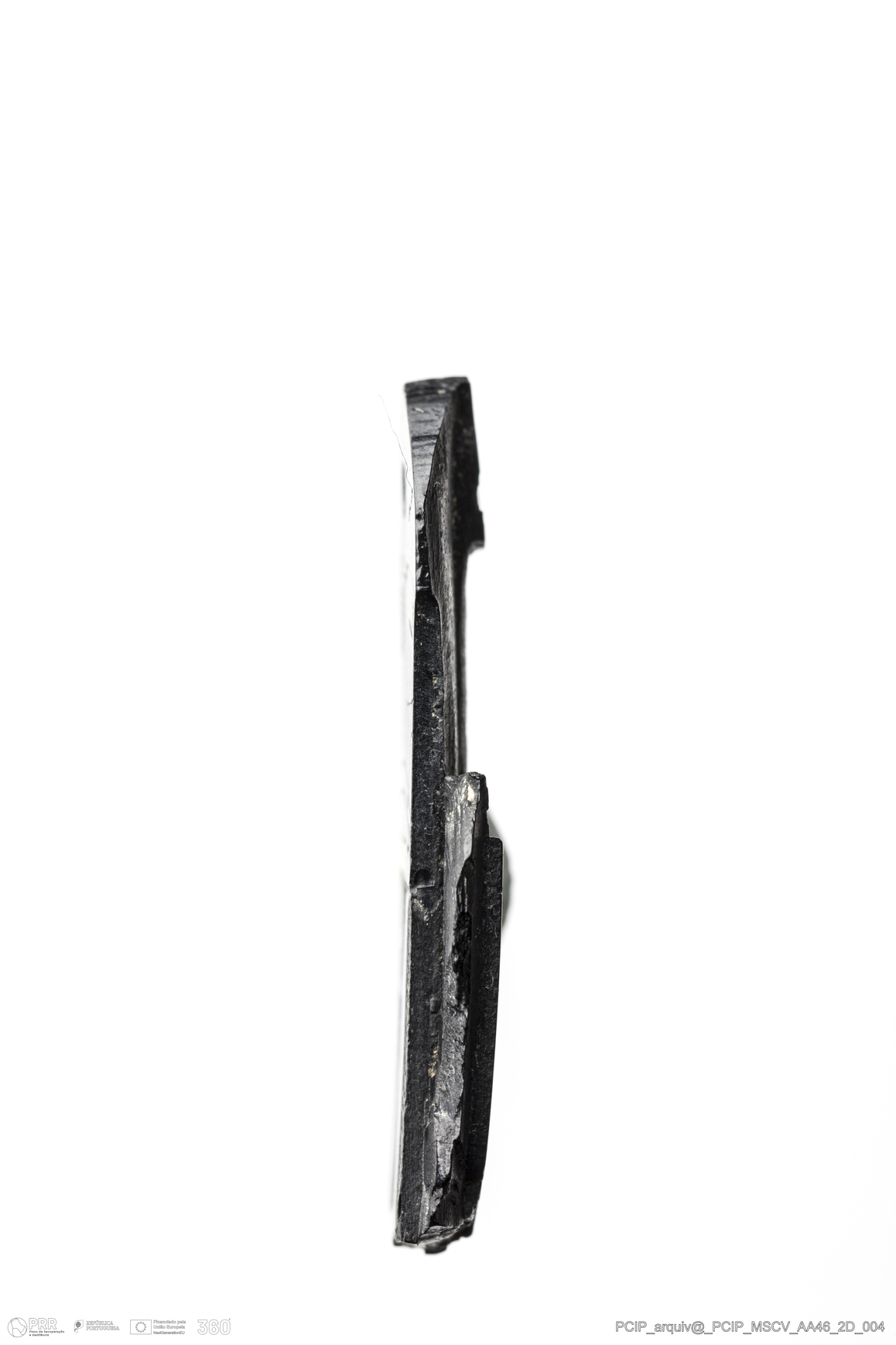 Matéria/Técnica: Azeviche; Cronologia: Século XVI-XVII; Autoria: Desconhecida; Dimensões: Largura: 14mm Comprimento / Profundidade: 34mm; Espessura: 3mm.
