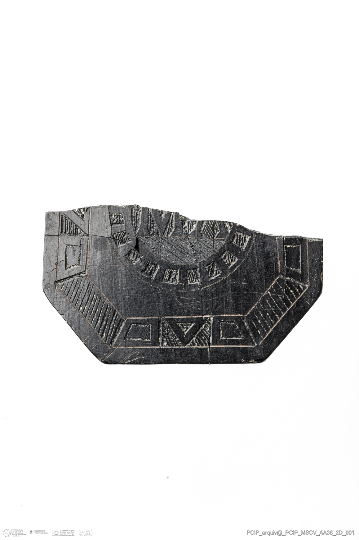 Matéria/Técnica: Azeviche; Cronologia: Século XVI-XVII; Autoria: Desconhecida; Dimensões: Largura: 32mm Altura / Espessura: 3mm Comprimento / Profundidade: 18mm.