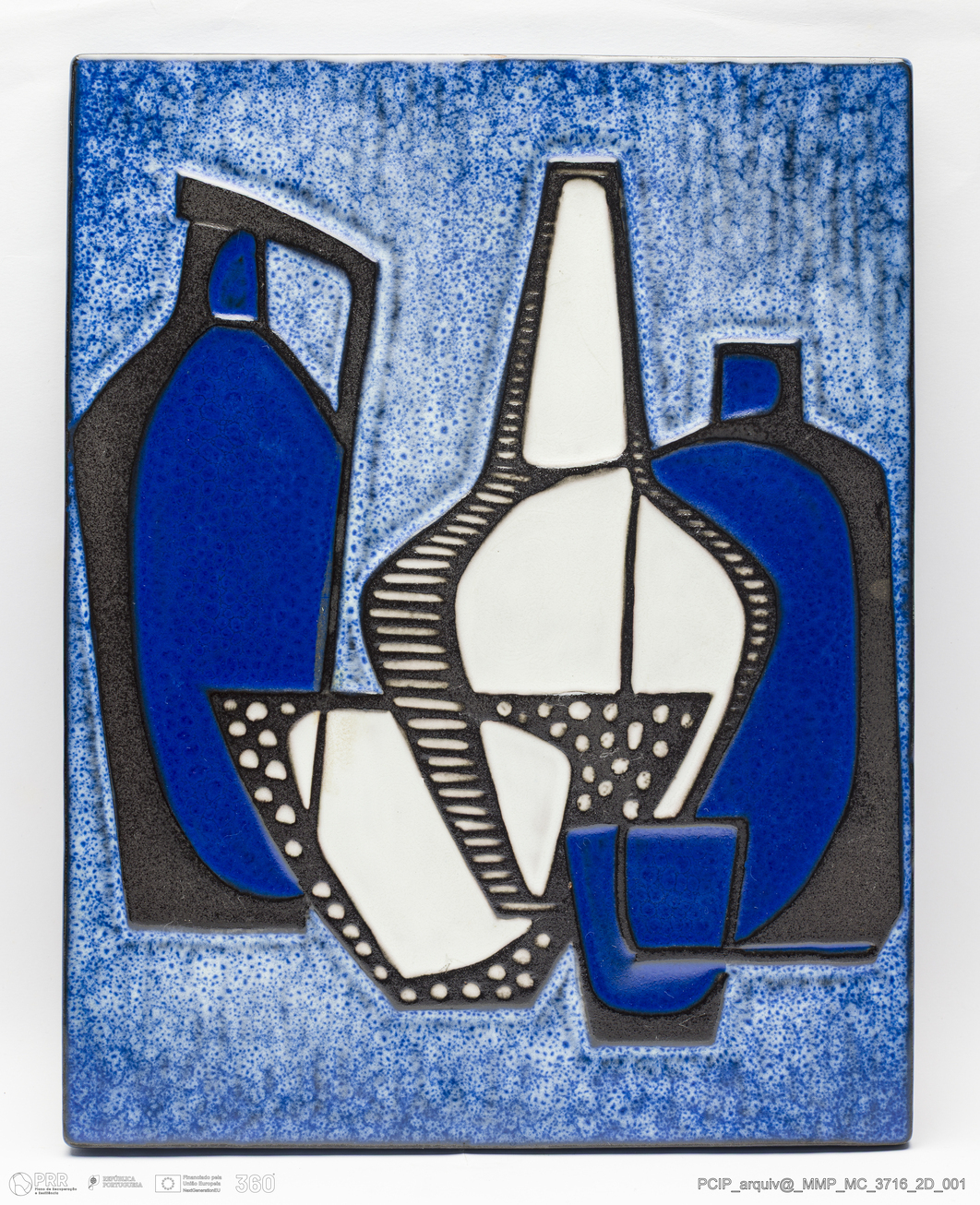 Matéria/Técnica: Barro vermelho moldado. Vidrado polícromo: azul e branco. Pintura a frio no verso a castanho; Cronologia: Século XX; Autoria: H. Ralf / Buckeburg / Alemanha; Dimensões (cm): Largura: 24; Comprimento: 31.