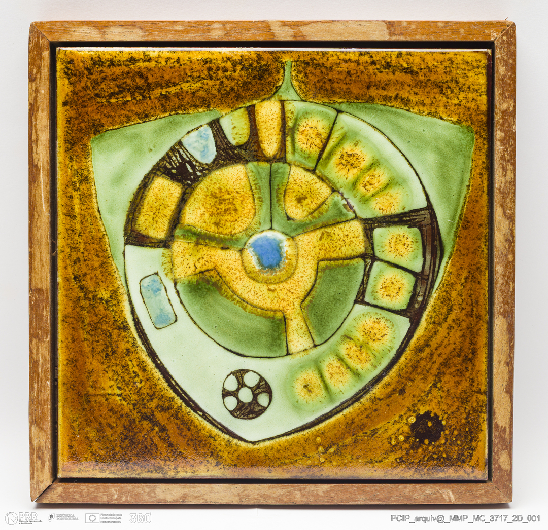 Matéria/Técnica: Barro vermelho moldado. Vidrado polícromo: castanho, verde, azul e amarelo; Cronologia: Século XX; Autoria: A. J. Guy / Estados Unidos; Dimensões (cm): Largura: 22,5; Comprimento: 22,5.