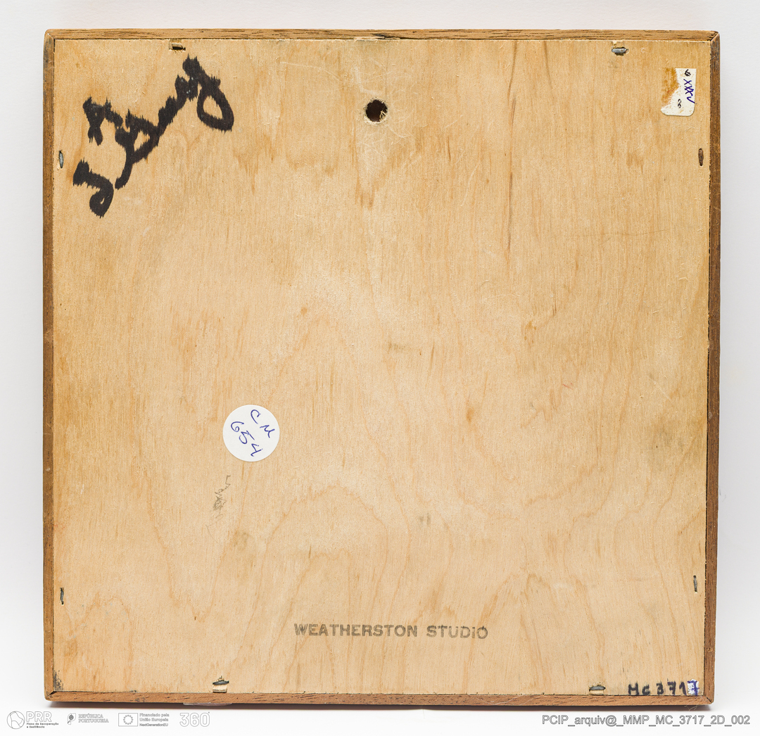 Matéria/Técnica: Barro vermelho moldado. Vidrado polícromo: castanho, verde, azul e amarelo; Cronologia: Século XX; Autoria: A. J. Guy / Estados Unidos; Dimensões (cm): Largura: 22,5; Comprimento: 22,5.