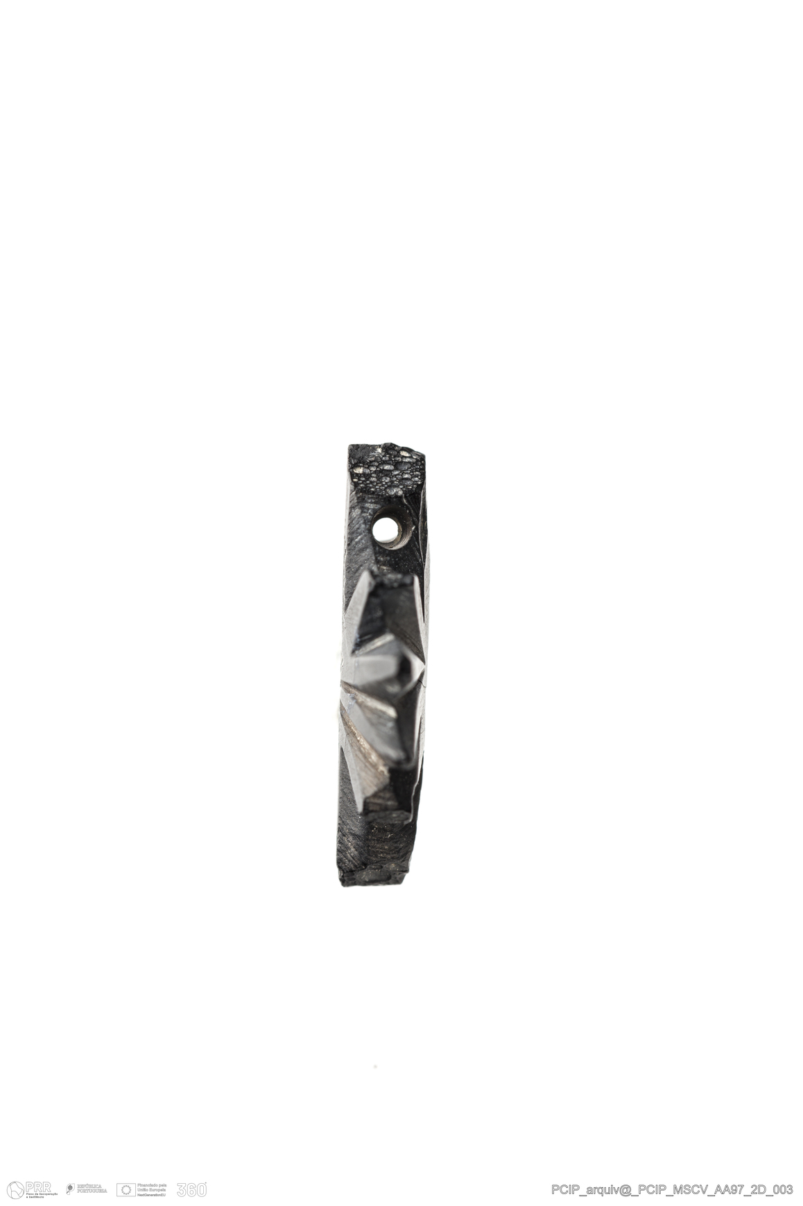 Matéria/Técnica: Azeviche; Cronologia: Século XVI- XVII; Autoria: Desconhecida; Dimensões: Comprimento: 15mm; Largura: 11mm; Espessura: 3mm.