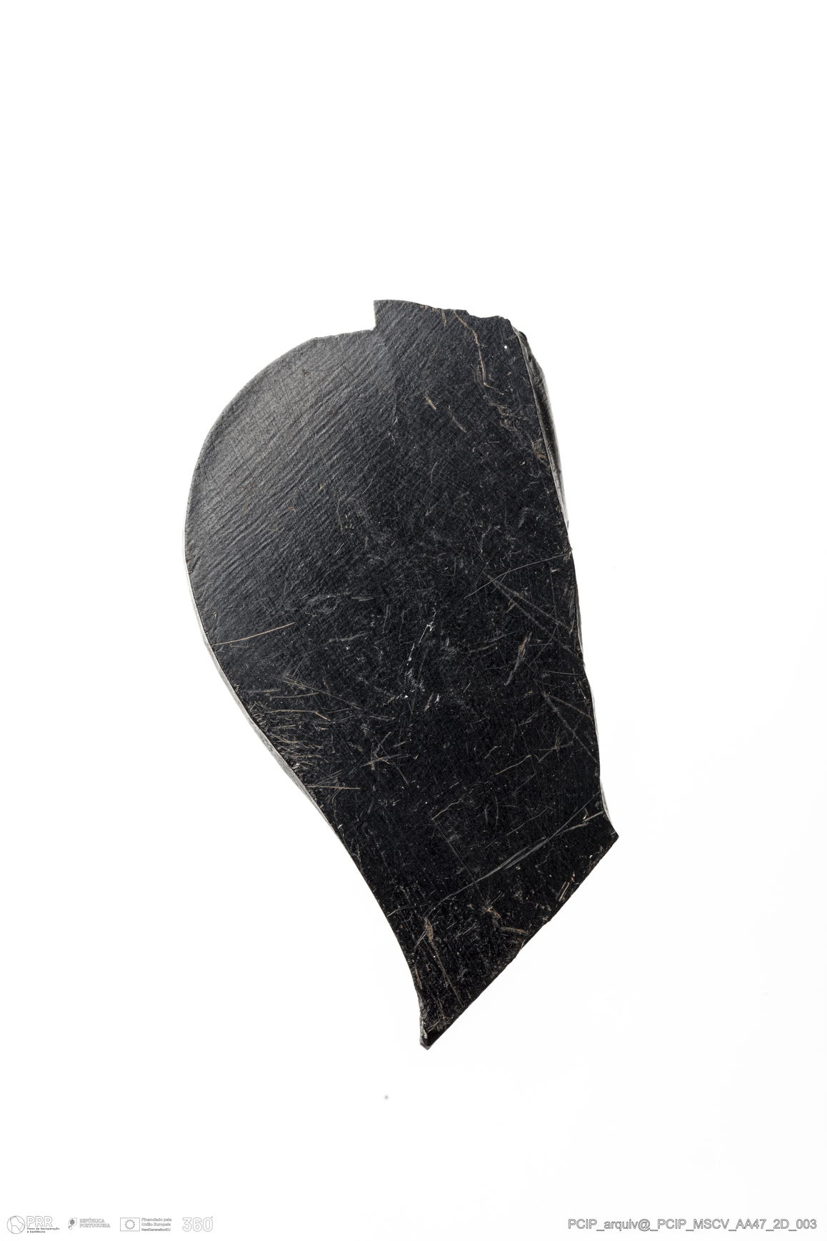 Matéria/Técnica: Azeviche; Cronologia: Século XVI-XVII; Autoria: Desconhecida; Dimensões: Largura: 17mm Comprimento / Profundidade: 33mm; Espessura: 3mm.