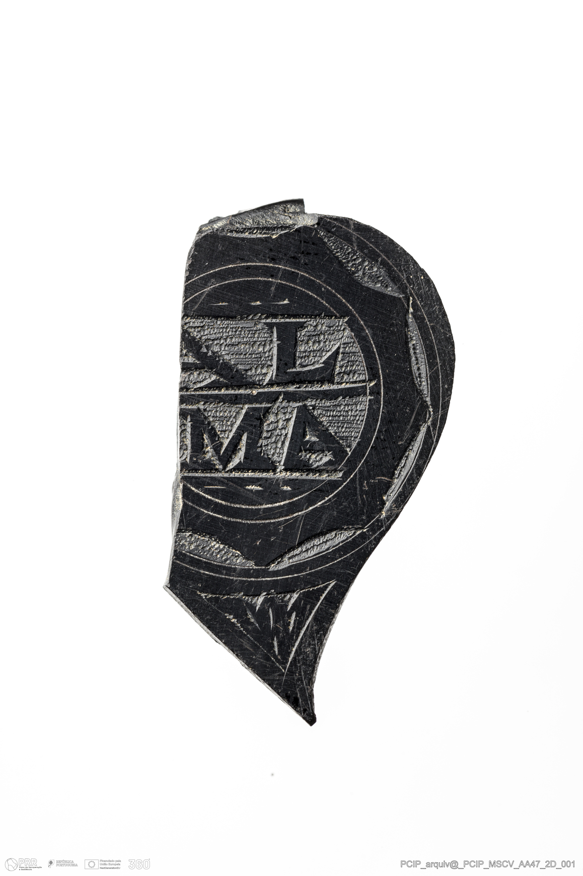 Matéria/Técnica: Azeviche; Cronologia: Século XVI-XVII; Autoria: Desconhecida; Dimensões: Largura: 17mm Comprimento / Profundidade: 33mm; Espessura: 3mm.