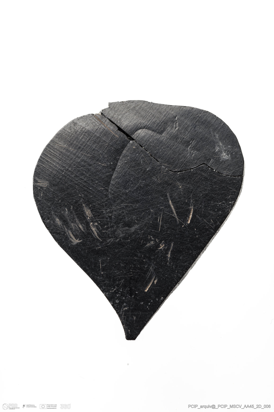 Matéria/Técnica: Azeviche; Cronologia: Século XVI-XVII; Autoria: Desconhecida; Dimensões: Largura: 30mm Comprimento / Profundidade: 35mm; Espessura: 3mm.