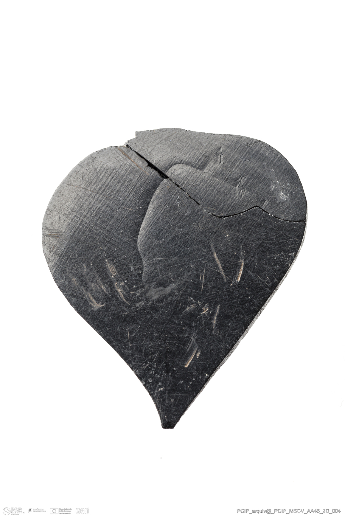 Matéria/Técnica: Azeviche; Cronologia: Século XVI-XVII; Autoria: Desconhecida; Dimensões: Largura: 30mm Comprimento / Profundidade: 35mm; Espessura: 3mm.