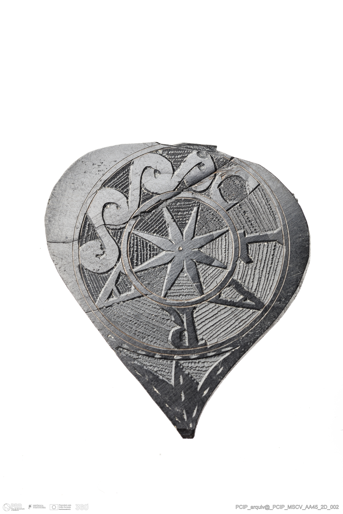 Matéria/Técnica: Azeviche; Cronologia: Século XVI-XVII; Autoria: Desconhecida; Dimensões: Largura: 30mm Comprimento / Profundidade: 35mm; Espessura: 3mm.