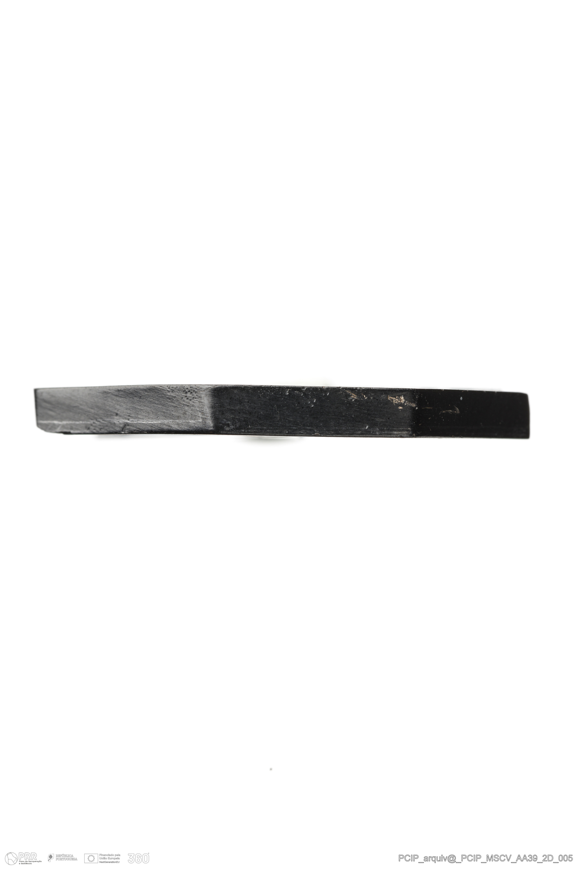 Matéria/Técnica: Azeviche; Cronologia: Século XVI-XVII; Autoria: Desconhecida; Dimensões: Largura: 37mm; Altura / Espessura: 4mm Comprimento / Profundidade: 35mm.