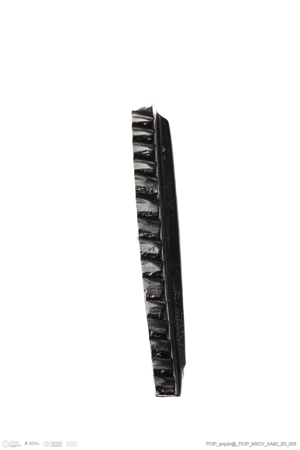 Matéria/Técnica: Azeviche; Cronologia: Século XVI- XVII; Autoria: Desconhecida; Dimensões: Comprimento: 50mm; Largura: 10mm; Espessura: 6mm.