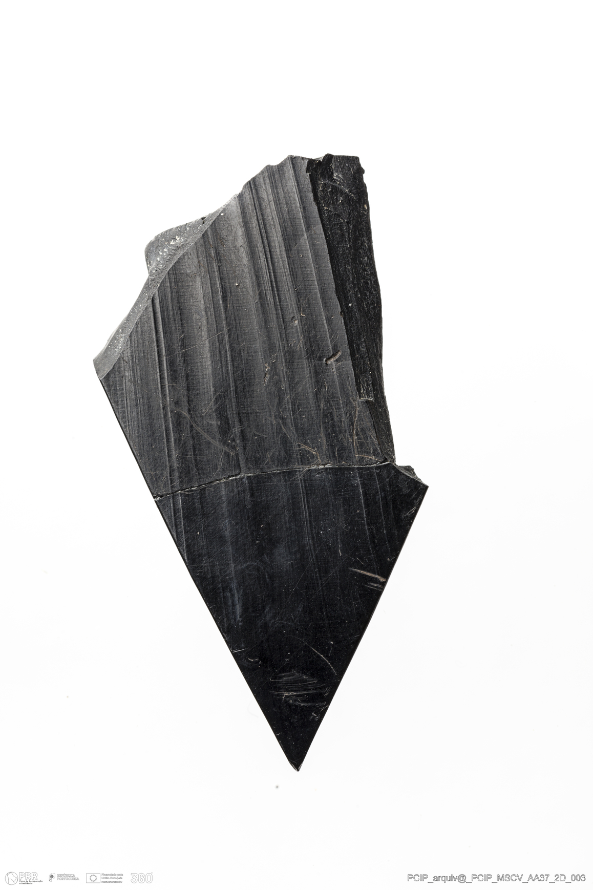 Matéria/Técnica: Azeviche; Cronologia: Século XVI-XVII; Autoria: Desconhecida; Dimensões: Largura: 26mm Altura / Espessura: 4mm Comprimento / Profundidade: 49mm.