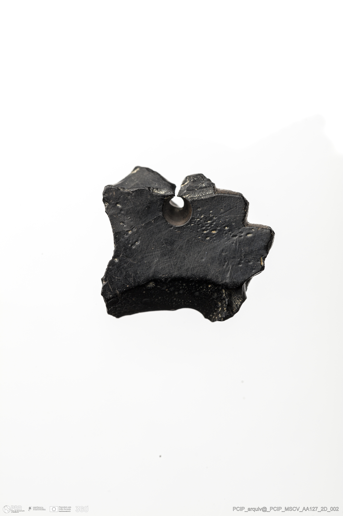Matéria/Técnica: Azeviche; Cronologia: Século XVI- XVII; Autoria: Desconhecida; Dimensões: Comprimento: 17mm; Largura: 14mm; Espessura: 6mm.