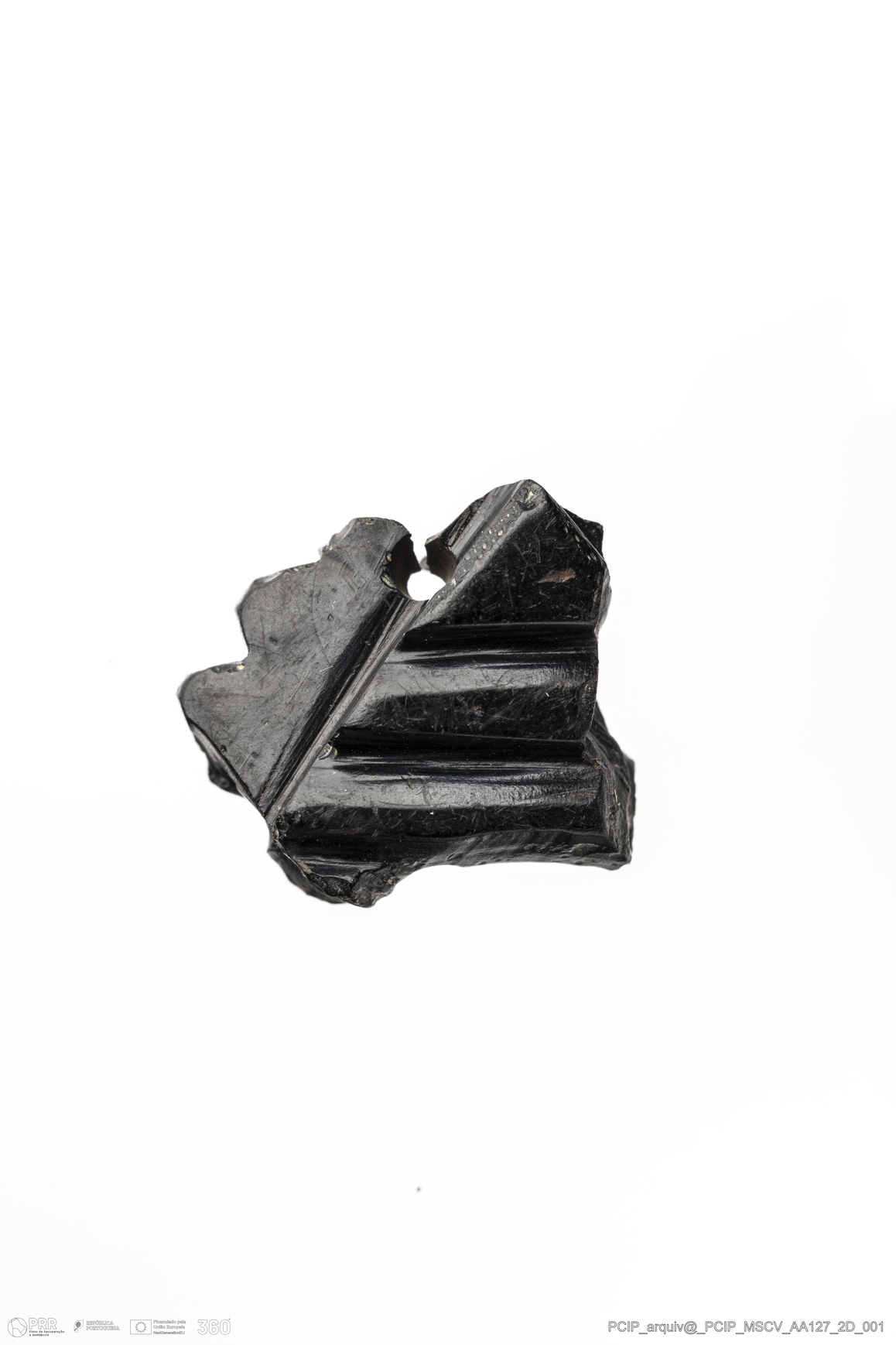 Matéria/Técnica: Azeviche; Cronologia: Século XVI- XVII; Autoria: Desconhecida; Dimensões: Comprimento: 17mm; Largura: 14mm; Espessura: 6mm.
