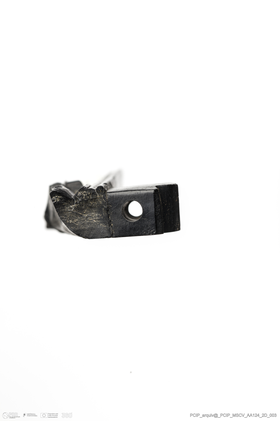 Matéria/Técnica: Azeviche; Cronologia: Século XVI- XVII; Autoria: Desconhecida; Dimensões: Comprimento: 24mm; Largura: 14mm; Espessura: 6mm.
