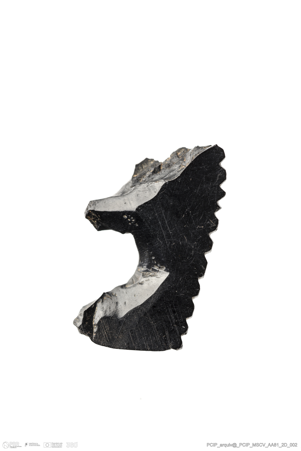 Matéria/Técnica: Azeviche; Cronologia: Século XVI- XVII; Autoria: Desconhecida; Dimensões: Comprimento: 23mm; Largura: 15mm; Espessura: 4mm.