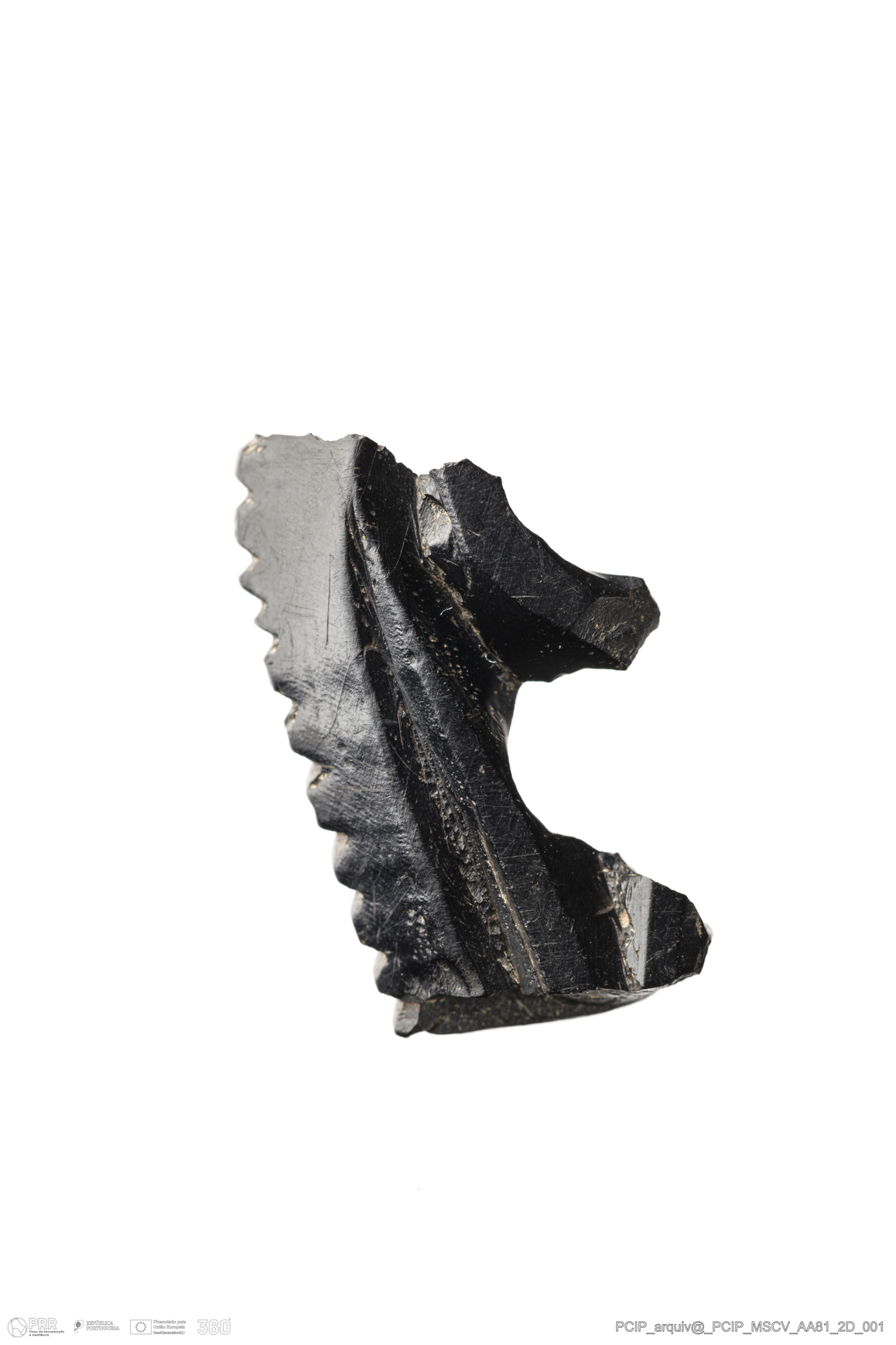 Matéria/Técnica: Azeviche; Cronologia: Século XVI- XVII; Autoria: Desconhecida; Dimensões: Comprimento: 23mm; Largura: 15mm; Espessura: 4mm.