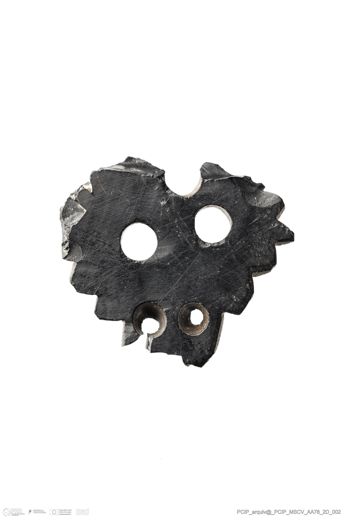 Matéria/Técnica: Azeviche; Cronologia: Século XVI- XVII; Autoria: Desconhecida; Dimensões: Comprimento: 22mm; Largura: 21mm; Espessura: 4mm.