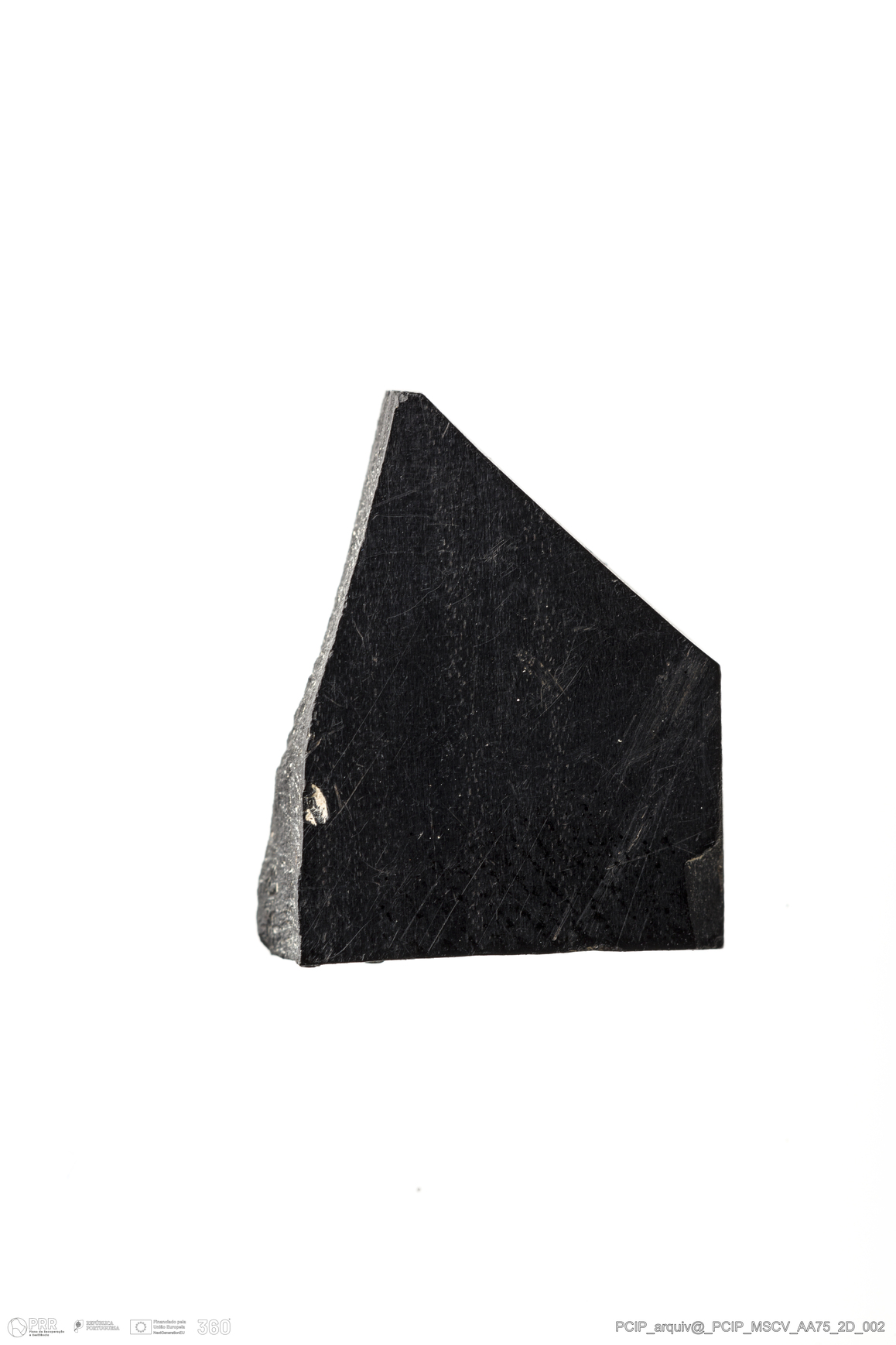Matéria/Técnica: Azeviche; Cronologia: Século XVI- XVII; Autoria: Desconhecida; Dimensões: Comprimento: 15mm; Largura: 14mm; Espessura: 2mm.