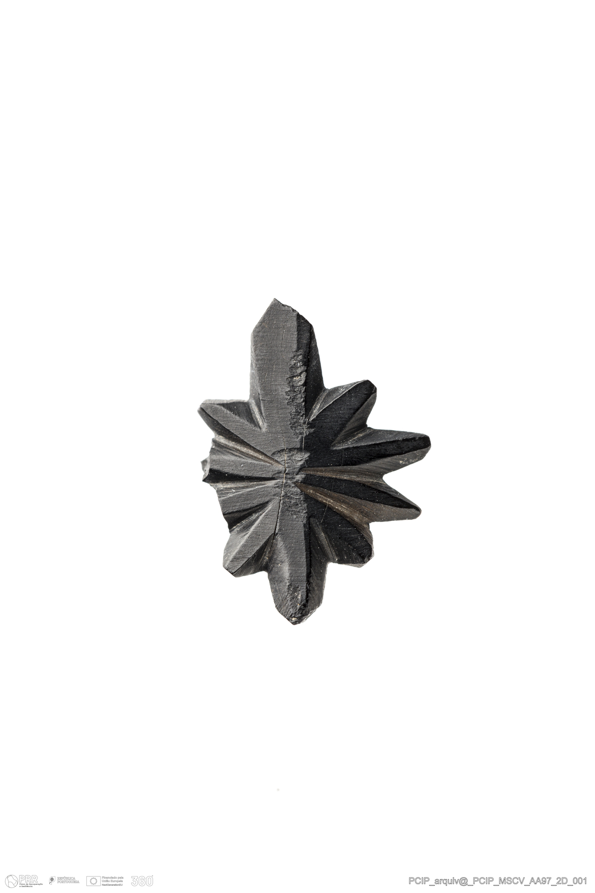 Matéria/Técnica: Azeviche; Cronologia: Século XVI- XVII; Autoria: Desconhecida; Dimensões: Comprimento: 15mm; Largura: 11mm; Espessura: 3mm.