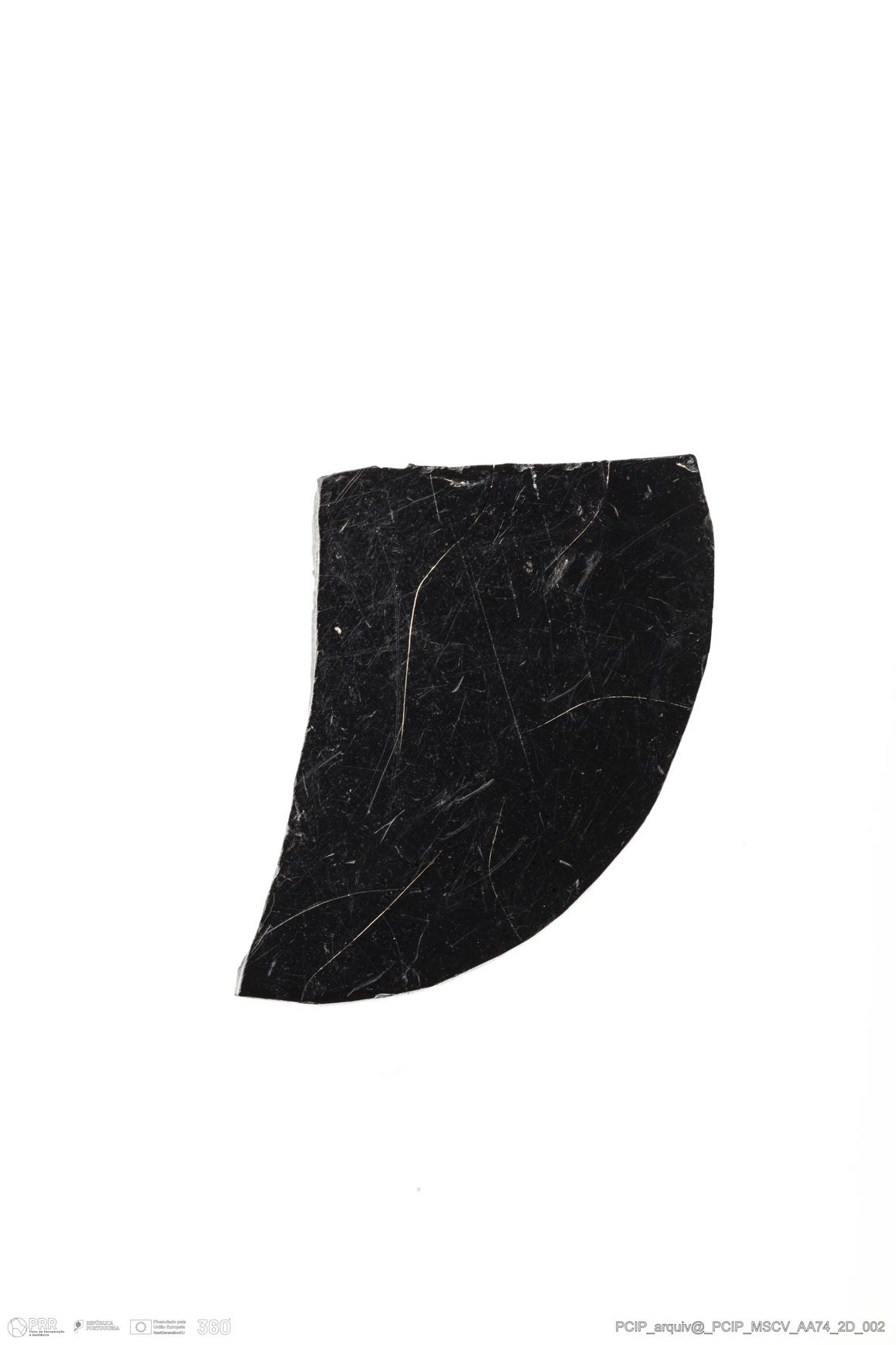 Matéria/Técnica: Azeviche; Cronologia: Século XVI- XVII; Autoria: Desconhecida; Dimensões: Comprimento: 21mm; Largura: 15mm; Espessura: 2mm.