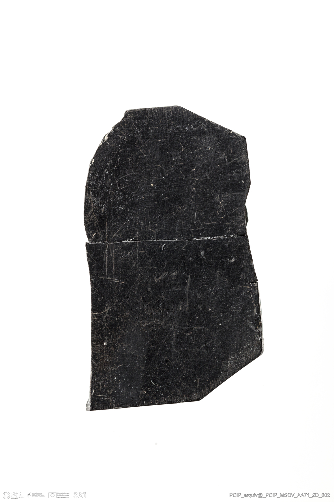 Matéria/Técnica: Azeviche; Cronologia: Século XVI- XVII; Autoria: Desconhecida; Dimensões: Comprimento: 30mm; Largura: 18mm; Espessura: 3mm.