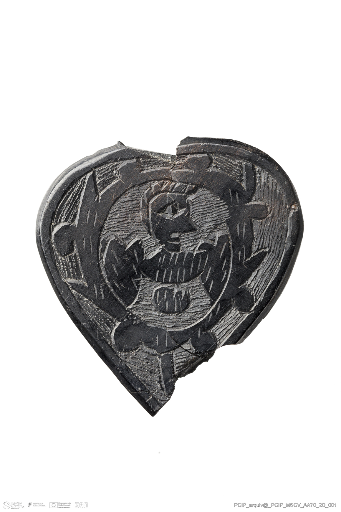 Matéria/Técnica: Azeviche; Cronologia: Século XVI-XVII; Autoria: Desconhecida; Dimensões: Largura: 31mm Comprimento / Profundidade: 33mm; Espessura: 3mm.
