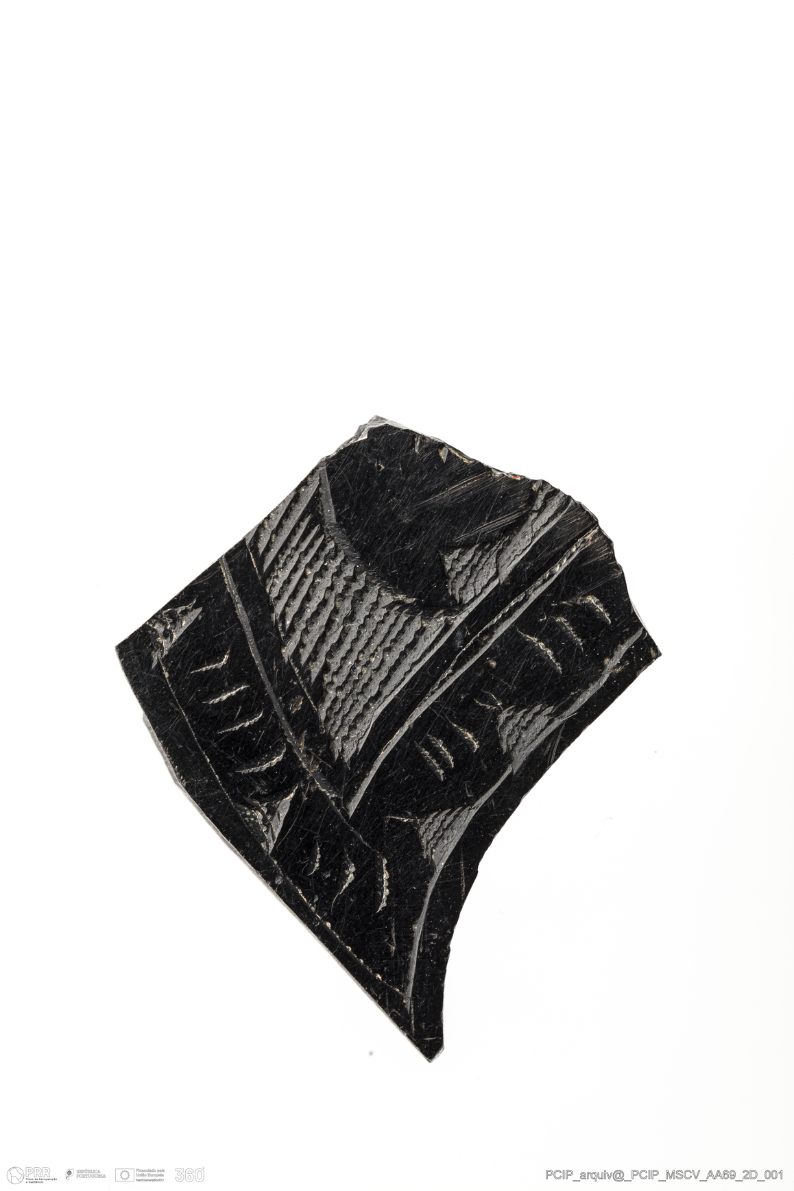 Matéria/Técnica: Azeviche; Cronologia: Século XVI- XVII; Autoria: Desconhecida; Dimensões: Comprimento: 22mm; Largura: 16mm; Espessura: 2mm.