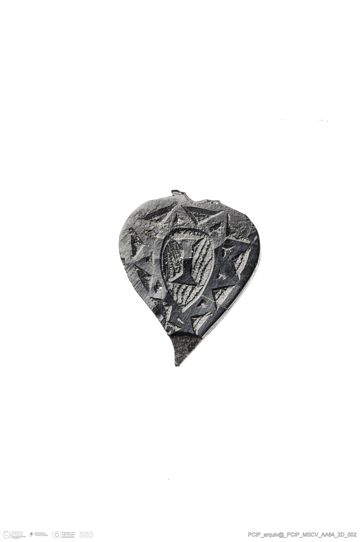 Matéria/Técnica: Azeviche; Cronologia: Século XVI-XVII; Autoria: Desconhecida; Dimensões: Largura: 11mm Altura / Espessura: 2mm Comprimento / Profundidade: 13mm.