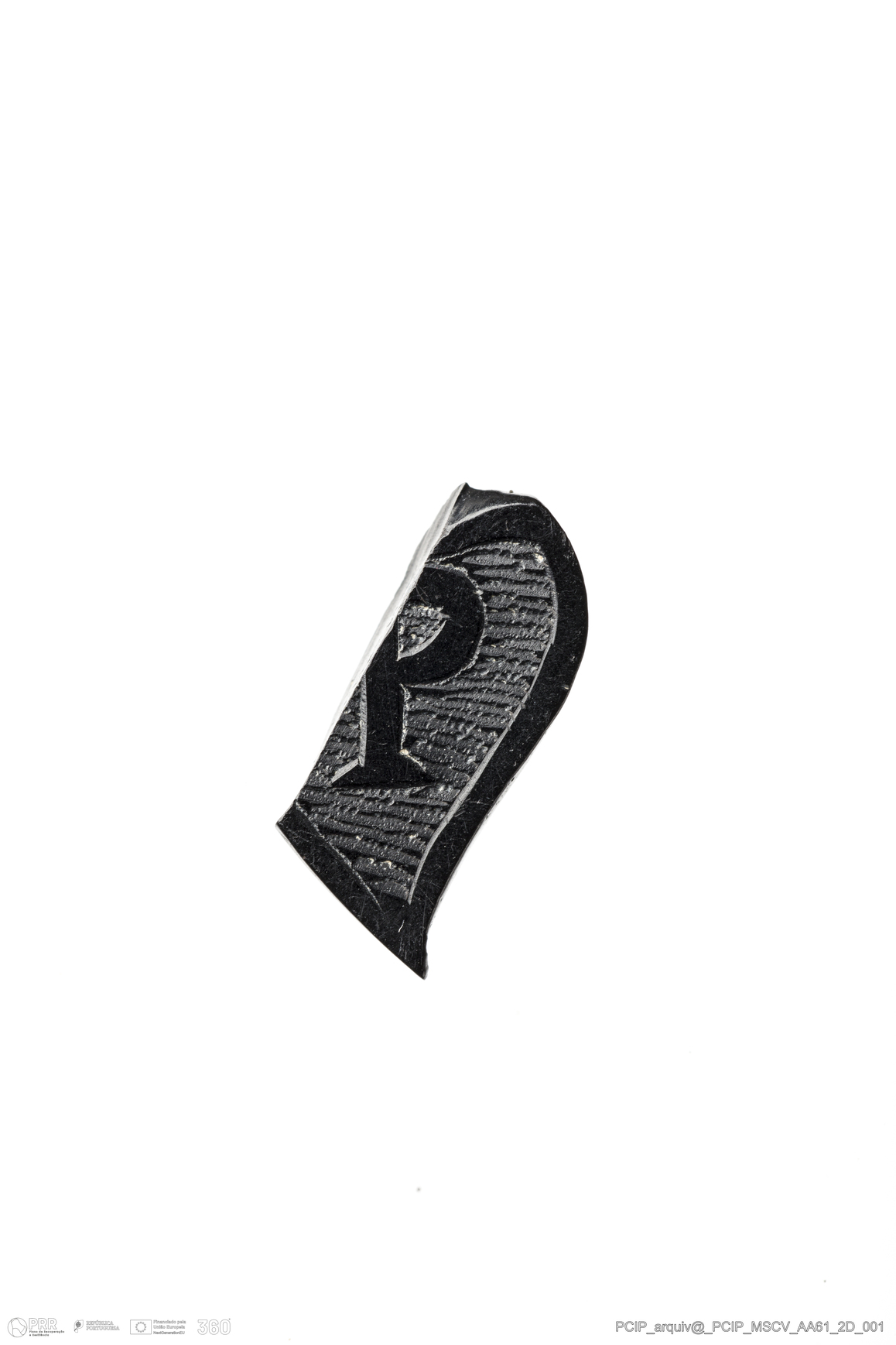 Matéria/Técnica: Azeviche; Cronologia: Século XVI-XVII; Autoria: Desconhecida; Dimensões: Largura: 8mm Comprimento / Profundidade: 15mm; Espessura: 2mm.