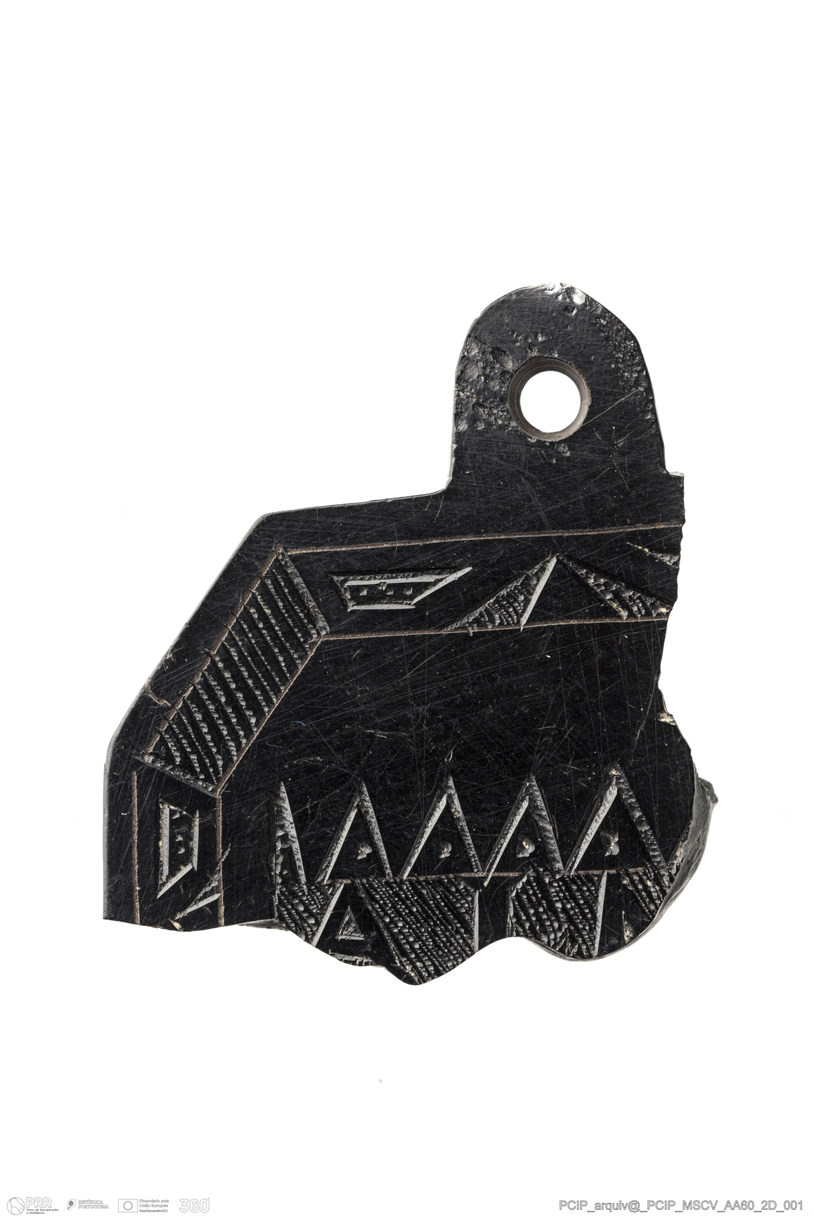 Matéria/Técnica: Azeviche; Cronologia: Século XVI- XVII; Autoria: Desconhecida; Dimensões: Comprimento: 30mm; Largura: 22mm; Espessura: 3mm.