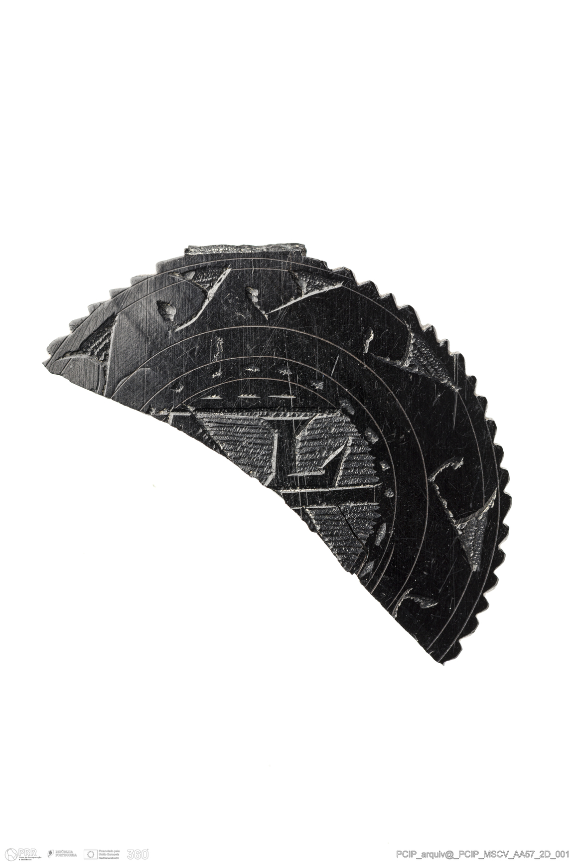 Matéria/Técnica: Azeviche; Cronologia: Século XVI- XVII; Autoria: Desconhecida; Dimensões: Comprimento: 30mm; Largura: 16mm; Espessura: 2,5mm.
