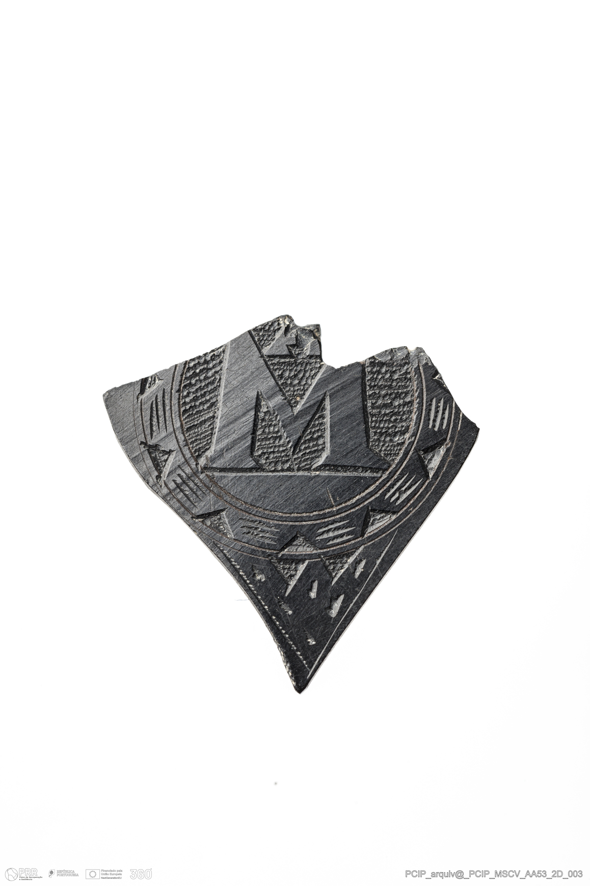 Matéria/Técnica: Azeviche; Cronologia: Século XVI-XVII; Autoria: Desconhecida; Dimensões: Largura: 23mm Altura / Espessura: 2mm Comprimento / Profundidade: 23mm.