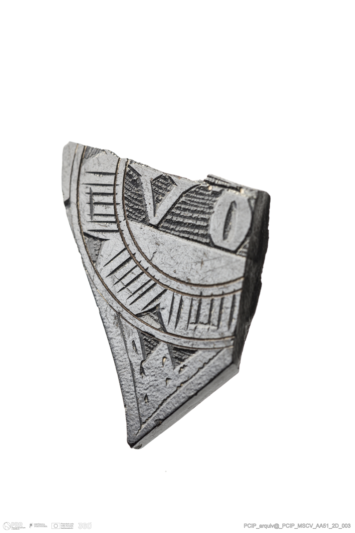 Matéria/Técnica: Azeviche; Cronologia: Século XVI- XVII; Autoria: Desconhecida; Dimensões: Comprimento: 23mm; Largura: 21mm; Espessura: 3mm.