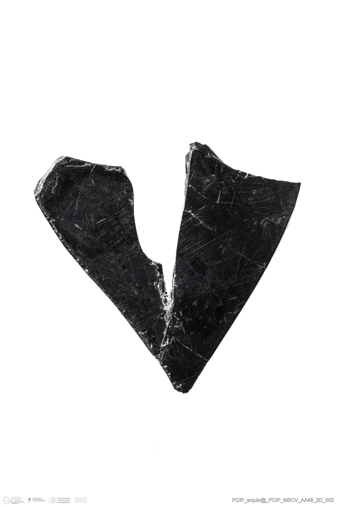Matéria/Técnica: Azeviche; Cronologia: Século XVI-XVII; Autoria: Desconhecida; Dimensões: Largura: 34mm Comprimento / Profundidade: 31mm; Espessura: 2mm.