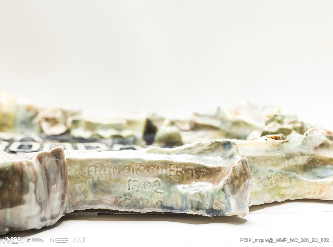 Matéria/Técnica: Barro vermelho modelado e moldado. Vidrado polícromo: azul, verde, castanho e branco; Cronologia: 1902; Autoria: Francisco Elias / Fábrica de Faianças das Caldas da Rainha, Portugal; Dimensões (cm): Altura: 44,5; Largura: 60.