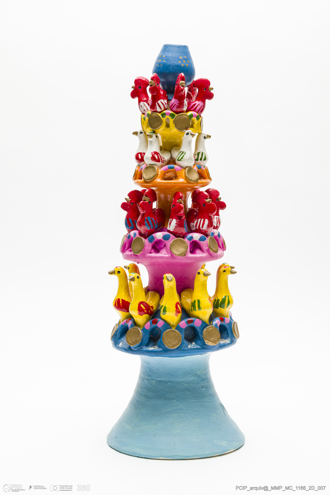 Matéria/Técnica: Barro modelado. Pintura a frio nas cores azul, amarelo, rosa, branco e vermelho; Cronologia: 1984; Autoria: Domingos Gonçalves Lima, Lugar de Santo Amaro, Santa Maria de Galegos - Barcelos; Dimensões (cm): Altura: 35,5; Diâmetro: 12.