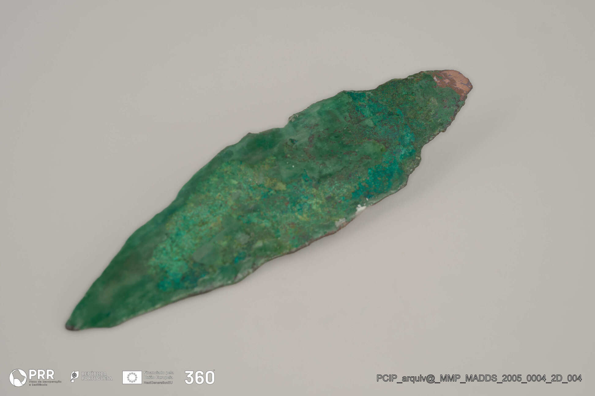 Matéria/Técnica: Cobre; Cronologia: III - III milénio a.C; Autoria: Desconhecida; Dimensões (cm): 2,6 x 9,3 x 0,3.
