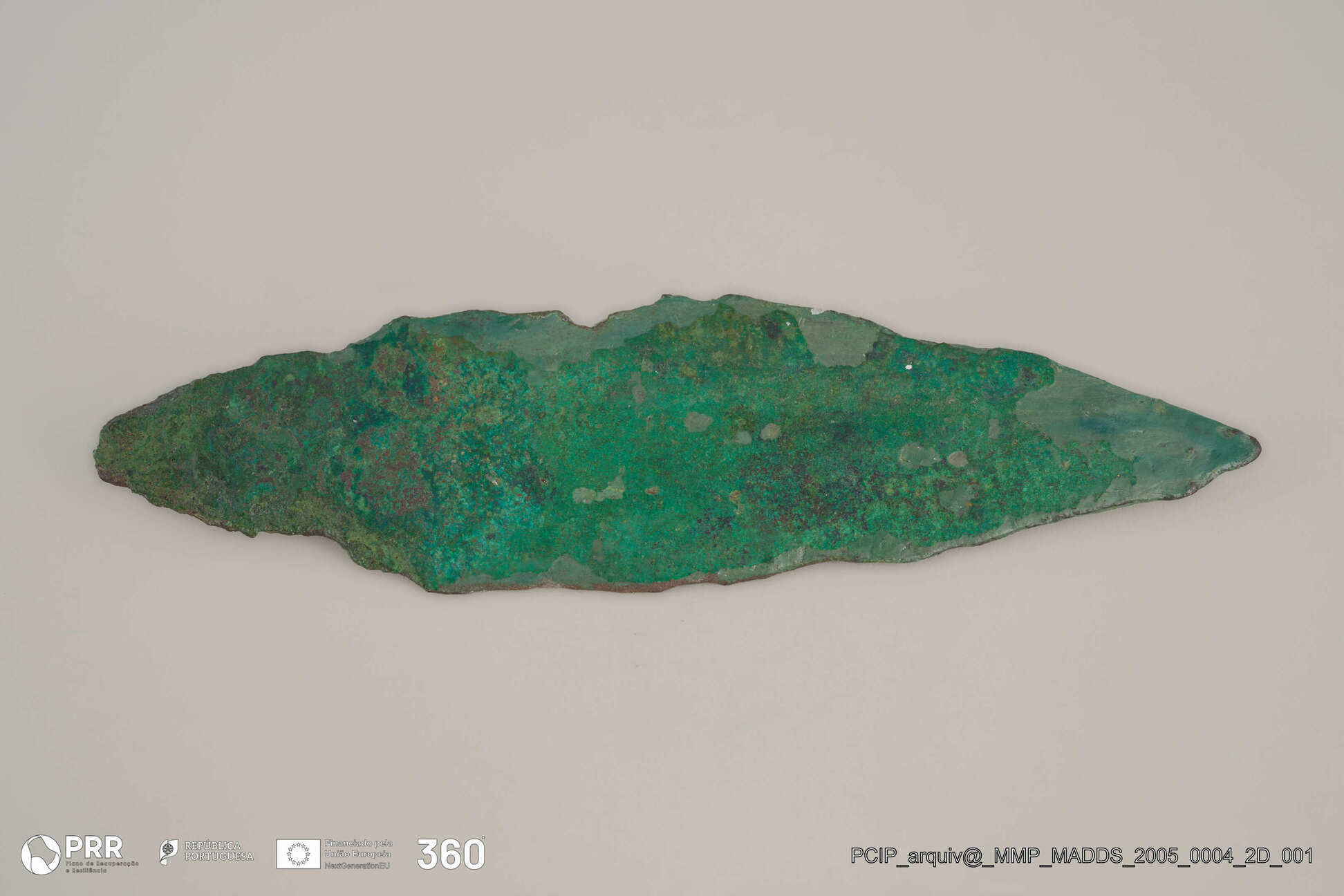 Matéria/Técnica: Cobre; Cronologia: III - III milénio a.C; Autoria: Desconhecida; Dimensões (cm): 2,6 x 9,3 x 0,3.