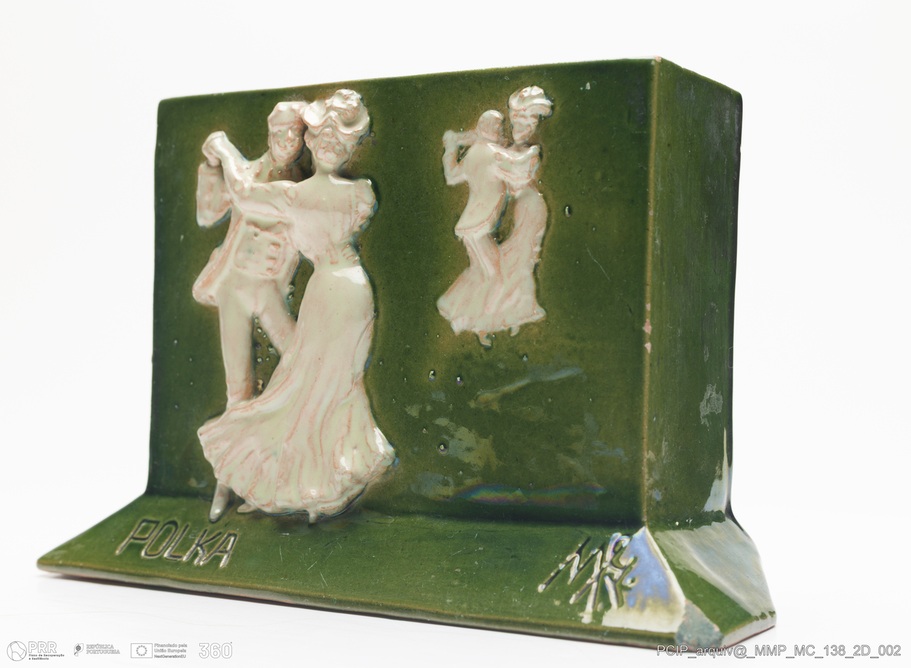 Matéria/Técnica: Barro vermelho moldado. Vidrado polícromo: verde e branco; Cronologia: 1906; Autoria: Manuel Gustavo Bordalo Pinheiro / Fábrica Bordalo Pinheiro, Caldas da Rainha; Dimensões (cm): Altura: 11; Largura: 17,5; Comprimento: 8,5.