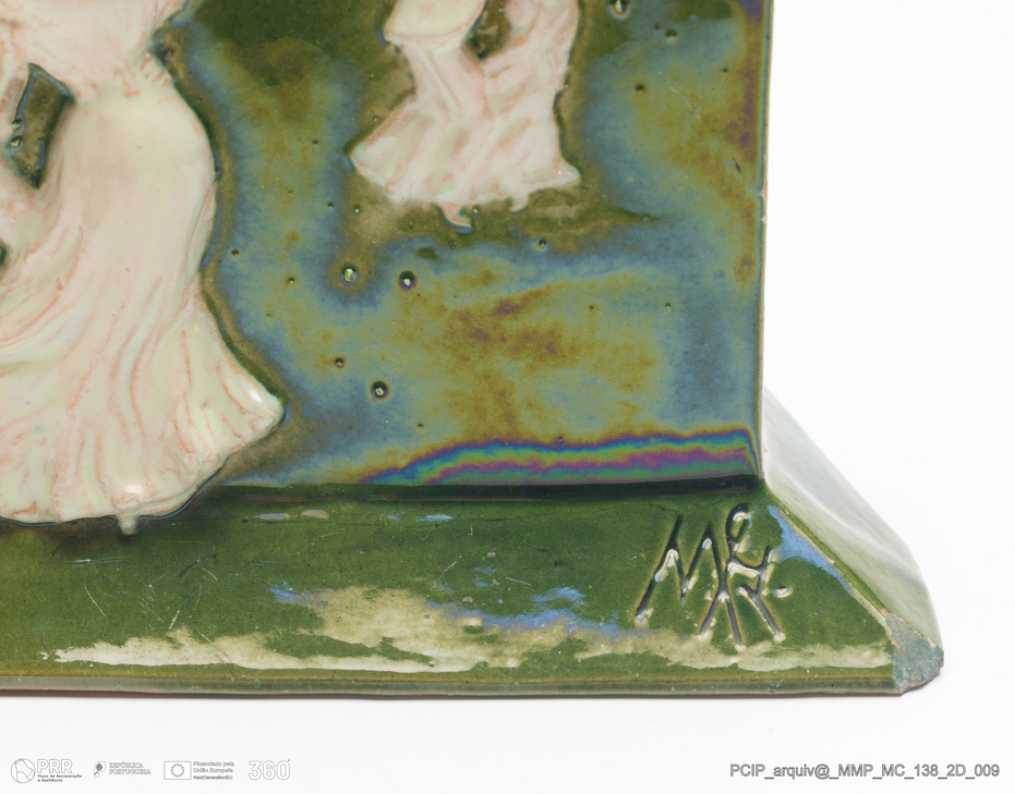Matéria/Técnica: Barro vermelho moldado. Vidrado polícromo: verde e branco; Cronologia: 1906; Autoria: Manuel Gustavo Bordalo Pinheiro / Fábrica Bordalo Pinheiro, Caldas da Rainha; Dimensões (cm): Altura: 11; Largura: 17,5; Comprimento: 8,5.