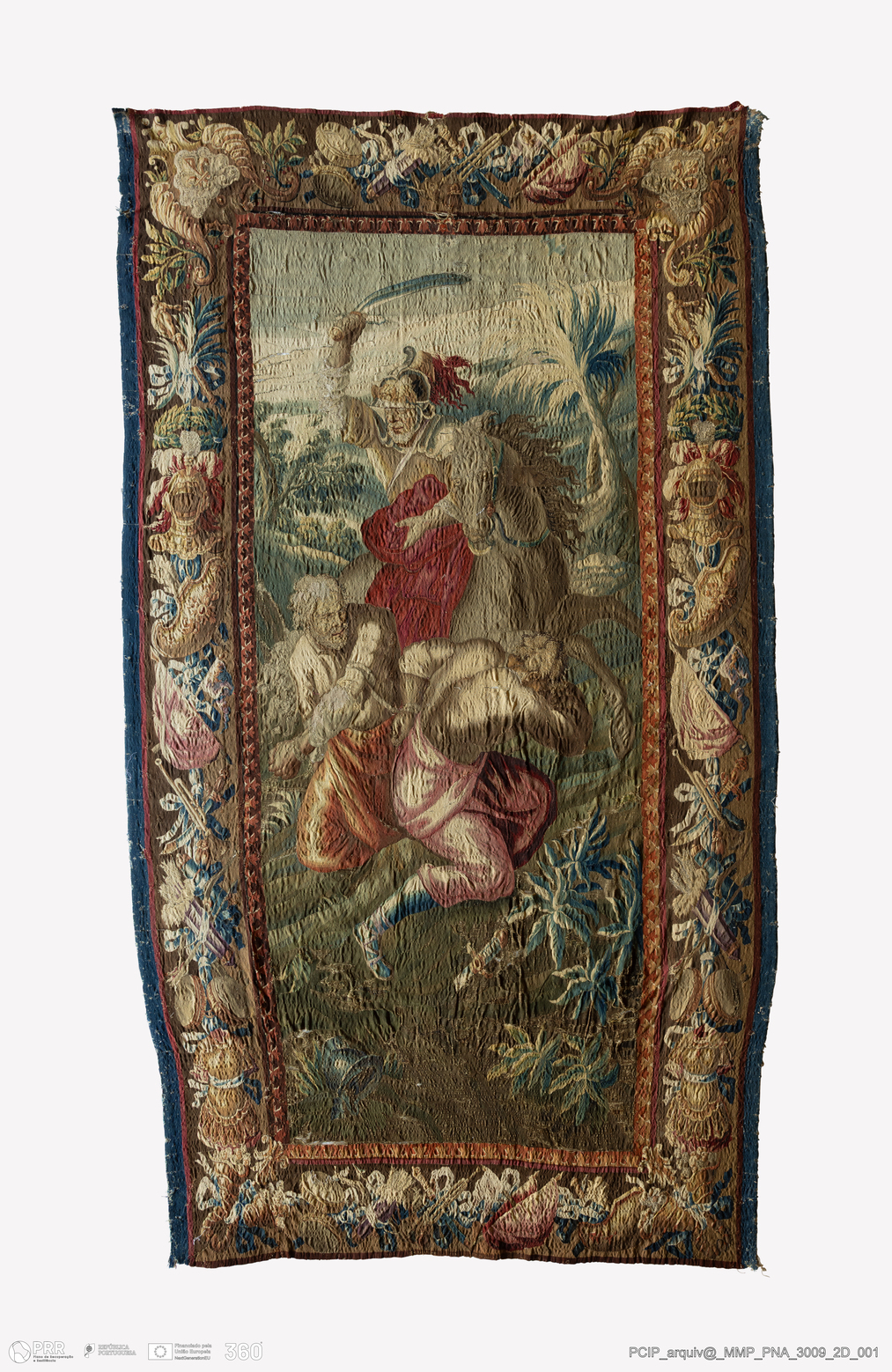 Matéria/Técnica: Tapeçaria de liço; Cronologia: Século XVIII; Autoria: Jeaucour, Michel; Dimensões: Altura: 358 cm x Largura: 202 cm.