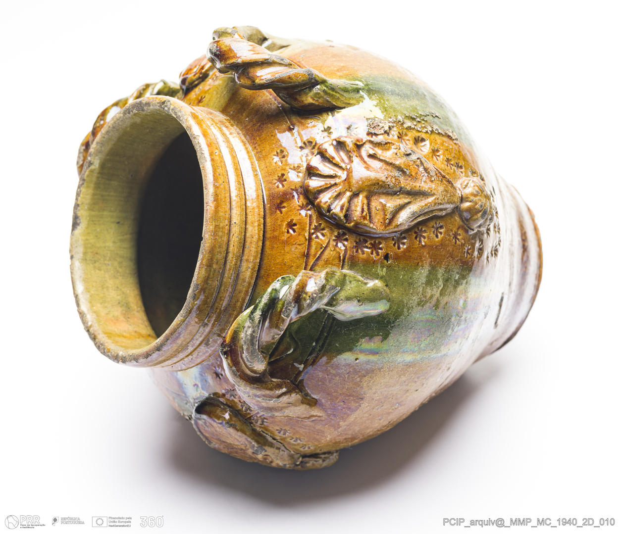 Matéria/Técnica: Barro vermelho rodado com aplicação de elementos. Vidrado polícromo: castanho de manganês e verde; Cronologia: século XIX-XX; Autoria: Desconhecido / Caldas da Rainha, Portugal; Dimensões (cm): Altura: 23,5; Diâmetro: 20,5.
