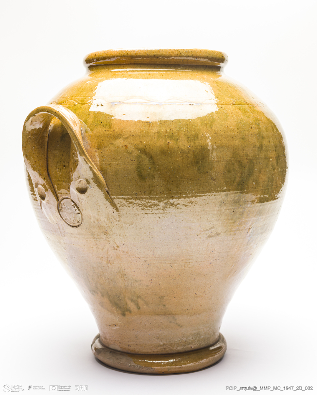 Matéria/Técnica: Barro vermelho rodado e modelado. Vidrado monocromo amarelo de ferro; Cronologia: século XIX; Autoria: Desconhecido / MCAM / Caldas da Rainha, Portugal; Dimensões (cm): Altura: 34; Diâmetro: 28,5.
