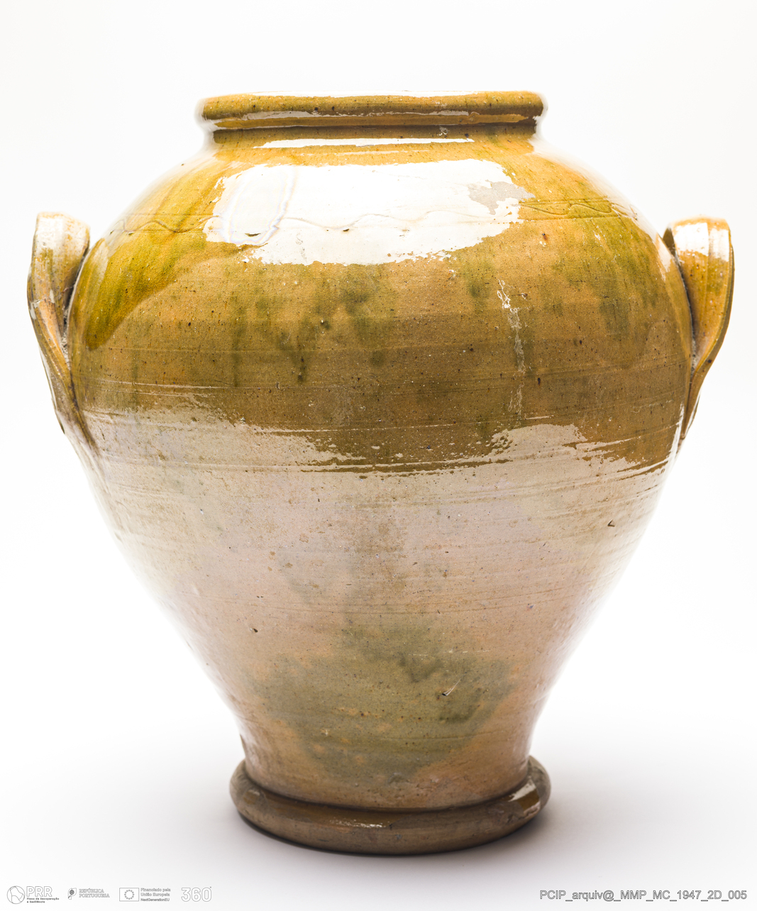 Matéria/Técnica: Barro vermelho rodado e modelado. Vidrado monocromo amarelo de ferro; Cronologia: século XIX; Autoria: Desconhecido / MCAM / Caldas da Rainha, Portugal; Dimensões (cm): Altura: 34; Diâmetro: 28,5.