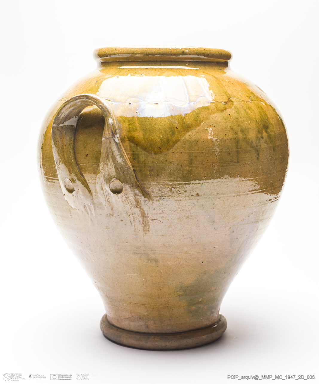 Matéria/Técnica: Barro vermelho rodado e modelado. Vidrado monocromo amarelo de ferro; Cronologia: século XIX; Autoria: Desconhecido / MCAM / Caldas da Rainha, Portugal; Dimensões (cm): Altura: 34; Diâmetro: 28,5.