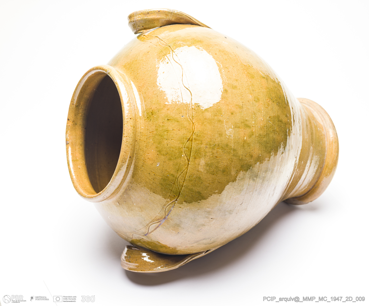 Matéria/Técnica: Barro vermelho rodado e modelado. Vidrado monocromo amarelo de ferro; Cronologia: século XIX; Autoria: Desconhecido / MCAM / Caldas da Rainha, Portugal; Dimensões (cm): Altura: 34; Diâmetro: 28,5.