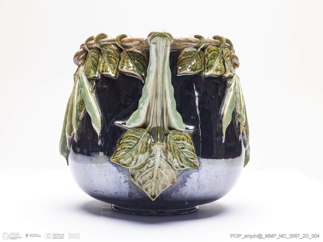 Matéria/Técnica: Barro moldado e modelado. Vidrado polícromo: negro metalizado, tons de verde de cobre, castanho de manganês e amarelo ferro; Cronologia: 1910; Autoria: António Augusto da Costa Mota / Fábrica de Faianças das Caldas da Rainha; Dimensões (cm): Altura: 42; Largura: 19; Comprimento: 31.